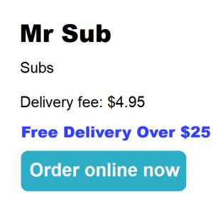 Mr Sub Subs Delivery fee: $4.95 Free Delivery Over $25 | Open for delivery: Mon-Wed: 11AM-8:30PM Thurs-Sat: 11AM-9:30PM Sun: 11AM-7:30PM |